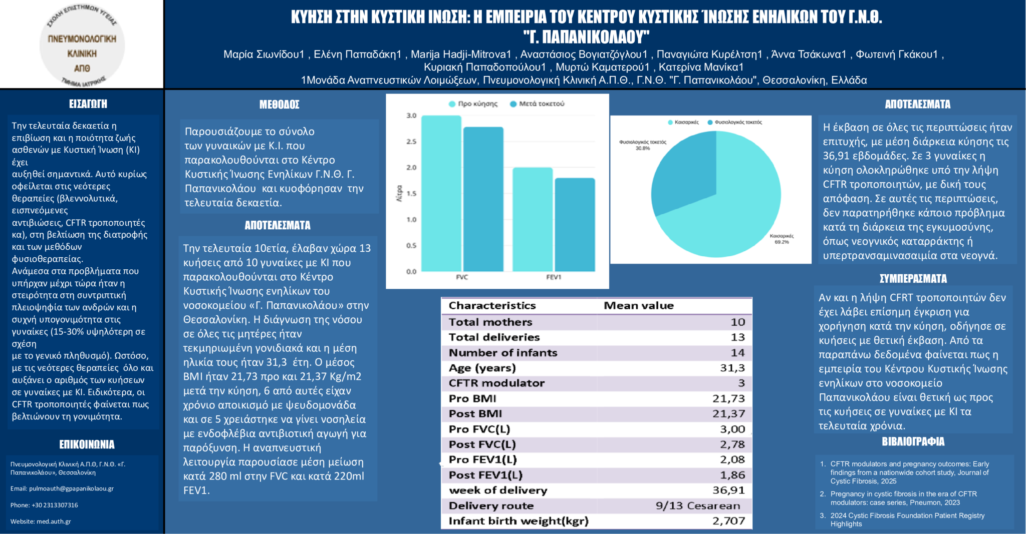 Την τελευταία 10ετία, έλαβαν χώρα 13 κυήσεις από 10 γυναίκες με ΚΙ που παρακολουθούνται στο Κέντρο Κυστικής Ίνωσης ενηλίκων του νοσοκομείου «Γ. Παπανικολάου» στην Θεσσαλονίκη. H διάγνωση της νόσου σε όλες τις μητέρες ήταν τεκμηριωμένη γονιδιακά και η μέση ηλικία τους ήταν 31,3 έτη. Ο μέσος BMI ήταν 21,73 πρo και 21,37 Kg/m2 μετά την κύηση, 6 από αυτές είχαν χρόνιο αποικισμό με ψευδομονάδα και σε 5 χρειάστηκε να γίνει νοσηλεία με ενδοφλέβια αντιβιοτική αγωγή για παρόξυνση. Η αναπνευστική λειτουργία παρουσίασε μέση μείωση κατά 280 ml στην FVC και κατά 220ml FEV1.