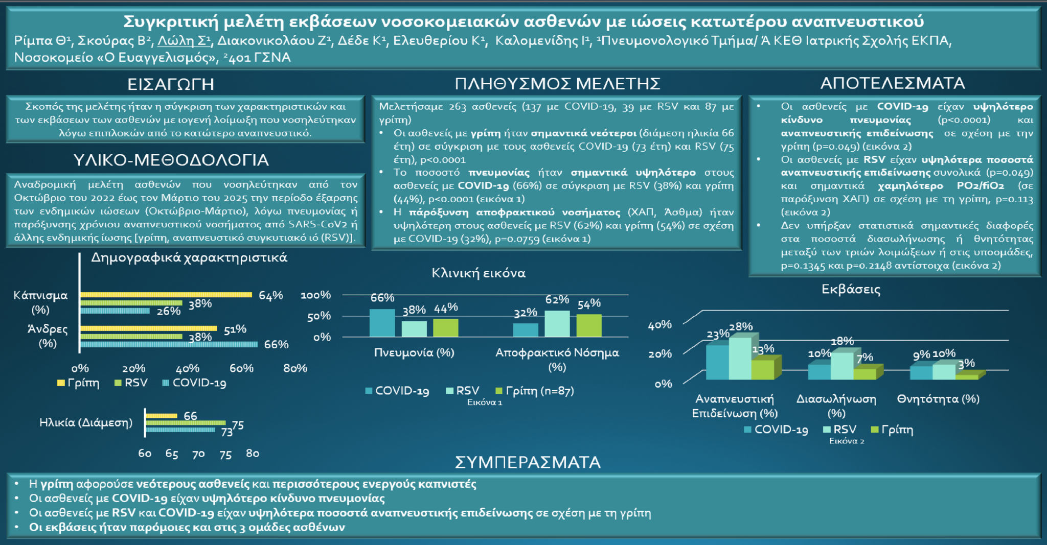 Η COVID-19 λοίμωξη ήταν συχνότερη αιτία νοσηλείας κατά τους ενδημικούς χειμερινούς μήνες την περίοδο 2022-25. Μεγαλύτερος αριθμός ασθενών με COVID-19 και RSV παρουσίασε αναπνευστική επιδείνωση κατά την νοσηλεία του σε σύγκριση με αυτούς με γρίπη, ενώ τα ποσοστά διασωλήνωσης και θνητότητας ήταν παρόμοια σε όλες τις ομάδες.