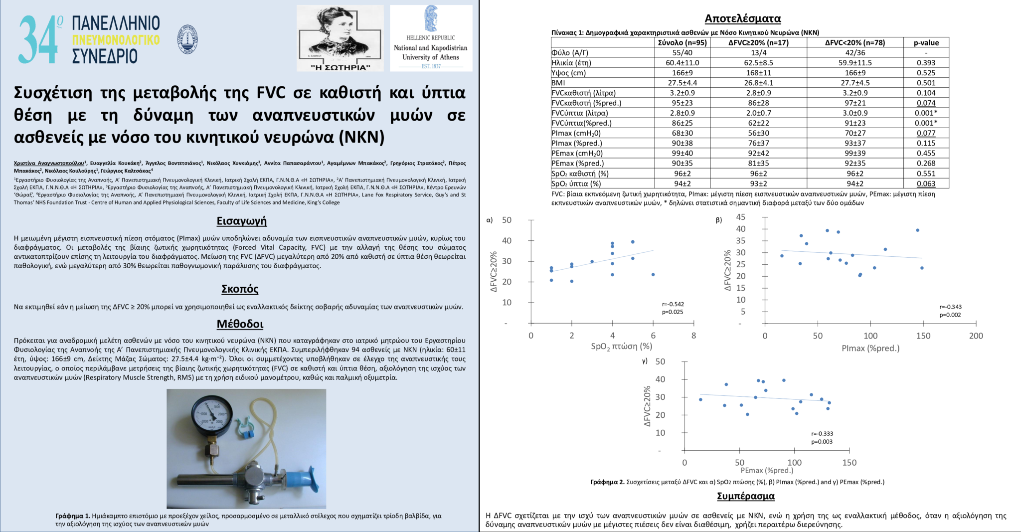 Εισαγωγή: Η μειωμένη μέγιστη εισπνευστική πίεση στόματος (PImax) υποδηλώνει αδυναμία των εισπνευστικών αναπνευστικών μυών. Μείωση της ζωτικής χωρητικότητας (FVC) μεγαλύτερη από 20% από καθιστή σε ύπτια θέση θεωρείται παθολογική, ενώ μεγαλύτερη από 30% θεωρείται παθογνωμονική παράλυσης του διαφράγματος. Σκοπός: Να εκτιμηθεί εάν η μείωση της ΔFVC ≥ 20% μπορεί να χρησιμοποιηθεί ως δείκτης σοβαρής αδυναμίας των αναπνευστικών μυών. Μέθοδοι: Πρόκειται για αναδρομική μελέτη με δεδομένα ALS ασθενών. Πραγματοποιήθηκε μέτρηση της FVC σε καθιστή και ύπτια θέση, αξιολόγηση δύναμης των αναπνευστικών μυών και παλμική οξυμετρία. Αποτελέσματα: Στη μελέτη συμπεριλήφθηκαν 94 ασθενείς με ALS (ηλικία: 60 ± 11 έτη, ύψος: 166 ± 9 cm, BMI: 27.5 ± 4.4 kg·m⁻²). Η ζωτική χωρητικότητα μετρήθηκε σε καθιστή (FVCκαθιστή: 95±23 %pred.) και σε ύπτια θέση (FVCύπτια: 86±25 %pred.). Η PImax ήταν 90 ± 38 %pred. και η PEmax 90 ± 35 %pred. Σαράντα πέντε ασθενείς είχαν παθολογική PImax %pred., ενώ παθολογική PEmax %pred. παρατηρήθηκε σε 39 ασθενείς. Ο κορεσμός οξυγόνου ήταν 96±2% σε καθιστή θέση και 94±2% σε ύπτια με πτώση 2,4±2,2 %. Δεκαεπτά ασθενείς εμφάνισαν ΔFVC ≥ 20 %. Η ΔFVC ≥ 20 % συσχετίστηκε με την πτώση του SpO₂ από καθιστή σε ύπτια θέση (r: −0.542, p: 0.025), με την PImax %pred. (r: −0.343, p: 0.002) και την PEmax %pred (r: −0.333, p: 0.003). Δεν παρατηρήθηκαν στατιστικά σημαντικές διαφορές μεταξύ των ομάδων με ΔFVC ≥ 20 % και ΔFVC < 20 % όσον αφορά την PImax (76 ± 37 % έναντι 92 ± 36 %, p: 0.115) ή την PEmax (81 ± 35 % έναντι 91 ± 35 %, p: 0.268). Συμπέρασμα: Η ΔFVC σχετίζεται με την ισχύ των αναπνευστικών μυών σε ασθενείς με ALS, ενώ η χρήση της ως εναλλακτική μέθοδος, όταν η αξιολόγηση της δύναμης αναπνευστικών μυών με μέγιστες πιέσεις δεν είναι διαθέσιμη, όπως για παράδειγμα κατ’ οίκον, χρήζει περαιτέρω διερεύνησης.