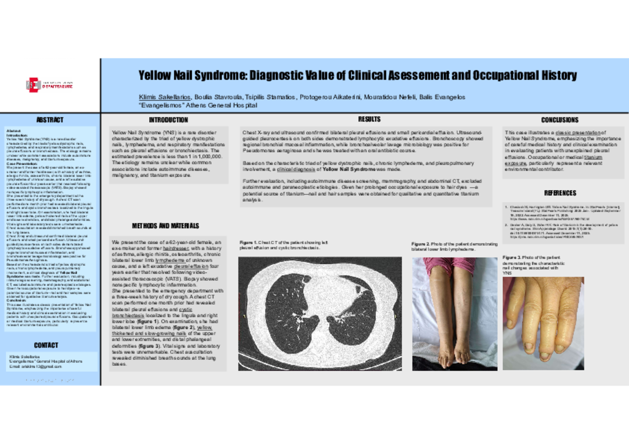 This case illustrates a classic presentation of Yellow Nail Syndrome, emphasizing the importance of careful medical history and clinical examination in evaluating patients with unexplained pleural effusions. Occupational or medical titanium exposure, particularly represent a relevant environmental contributor.