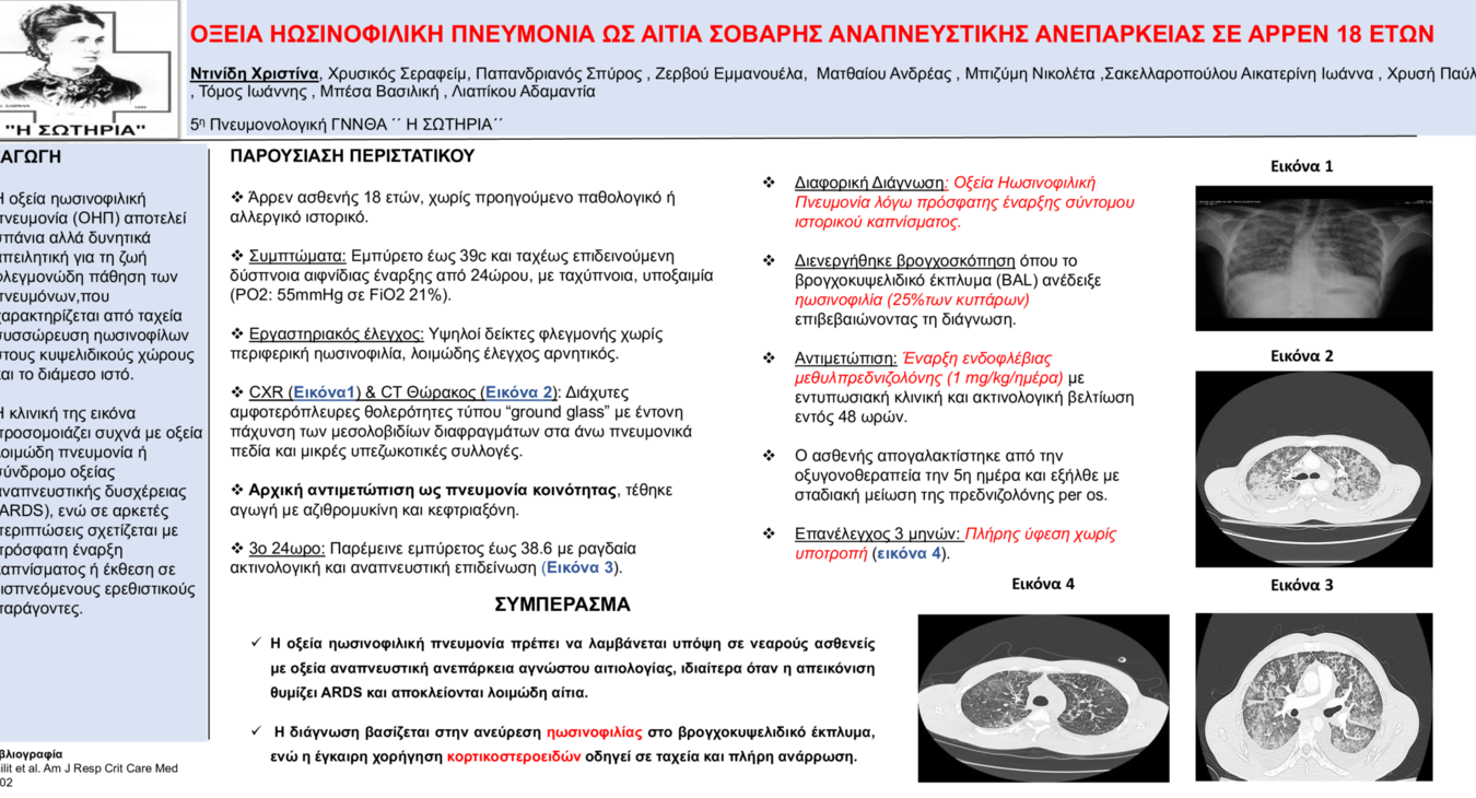 Χρυσικός Σεραφείμ ΟΞΕΙΑ ΗΩΣΙΝΟΦΙΛΙΚΗ ΠΝΕΥΜΟΝΙΑ ΩΣ ΑΙΤΙΑ ΣΟΒΑΡΗΣ ΑΝΑΠΝΕΥΣΤΙΚΗΣ ΑΝΕΠΑΡΚΕΙΑΣ ΣΕ ΑΡΡΕΝ 18 ΕΤΩΝ / Διάχυτες Διάμεσες Πνευμονοπάθειες, Επαγγελματικά Νοσήματα Πνεύμονος & Ατμοσφαιρική Ρύπανση